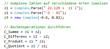 Diese Visual Studio Solution besteht aus zwei Projekten. Die ComplexLib ist eine DLL die in anderen DotNet Projekten verwendet werden kann. Es wird ein Typ Complex definiert und alle gängigen Operatoren angelegt. Das Projekt ComplexCalculator zeigt die Verwendung der Bibliothek in einigen Rechenbeispielen.